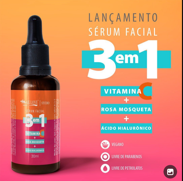 Este Sérum Facial 3 en 1 de Max Love combina los beneficios de la Vitamina C, la Rosa Mosqueta y el Ácido Hialurónico en un solo producto, aportando una acción antioxidante e hidratante. Posee además D'Pantenol, Extracto de Jengibre, Extracto de Higo, Extracto de Aloe Vera, Extracto de Algas Marinas y Extracto de Algodón, componentes que en conjunto ofrecen una acción emoliente y refrescante. Piel más firme, suave, hidratada y luminosa. Fórmula vegana, sin parabenos y sin vaselina.