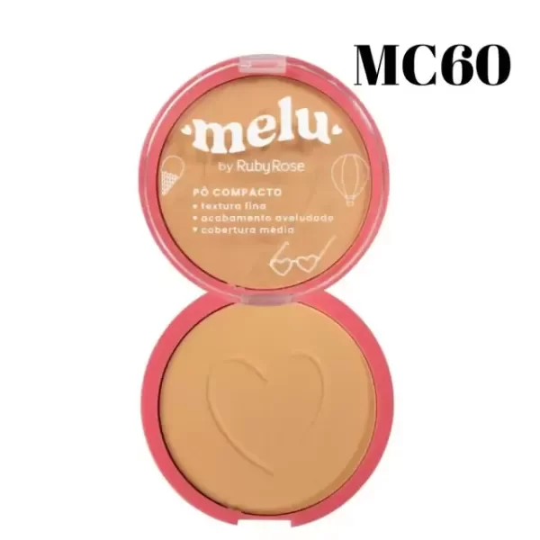El Polvo Compacto de Melu by Ruby Rose tiene una textura fina, acabado aterciopelado y cobertura media. El producto es suave, tiene acabado aterciopelado y seco, queda ligeramente mate en el rostro, pero sin resecar la piel. Formula vegana y apta para todo tipo de piel.